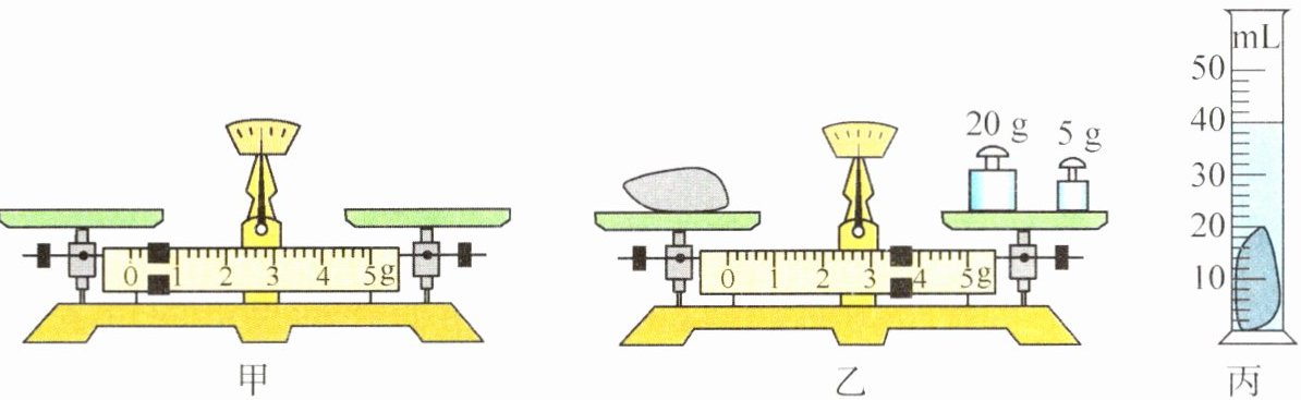 (2)用调好的天平称石块的质量,测量结果如图乙所示,则石块的质量为_______g. 接着他在量筒中倒入30 mL的水,再将石块浸没在水中,水面位置如图丙所示,则石块的密度为_______$g/cm^{3}$.