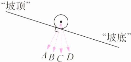 13.(2024·江苏扬州二模)重力是由于地球的吸引产生的,在南半球的人认为受到的重力方向相对所在地面来说竖直向下,同理在北半球的人认为受到的重力方向是________(选填“竖直向下”或“竖直向上”). 中国很多地方有“怪坡”景点,在“怪坡”上,“车倒爬,水倒流”. 科学家实地测量某一怪坡发现,怪坡的“坡顶”比“坡底”还要低,但受周围参照物的影响产生了错觉,如图所示,由此可见,科学测量才能弄清真相. 车轮在该怪坡上受到重力的方向可能为________(选填“A”“B”“C”或“D”).