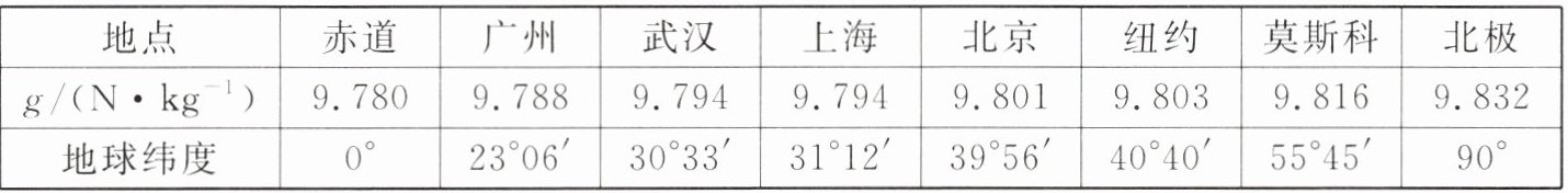 (3) ① 由表中数据可知,$g$ 值接近接近 $9.8\ N/kg$ 的城市是北京;② $g$ 值与 $9.8\ N/kg$ 相差比较大的两地是北极和赤道;③ 由表 2 可知,在不同纬度,$g$ 值不同,则 $g$ 值变化的原因可能是纬度纬度不同。