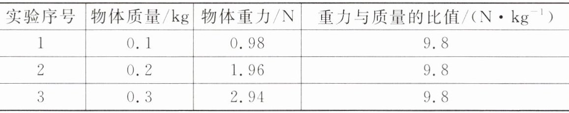 (2) 分析表中的数据可得,物体受到的重力与质量的比值不变,所以物体所受的重力与其质量成正比。