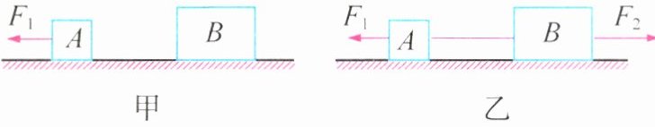 9.(2024·江苏淮安期末)水平桌面上有物体A、B. 如图甲,A在F₁的作用下向左做匀速直线运动;如图乙,A、B用轻绳水平连接,在F₁和F₂共同作用下一起向右做匀速直线运动. 水平拉力F₁=6 N、F₂=20 N. 图乙中,下列说法正确的是 ( )