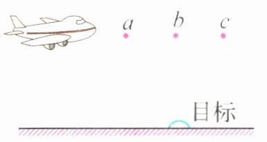 5. 如图所示,飞机要在飞行时向目标处空投救灾物资,空投位置应是a、b、c中的 ( )