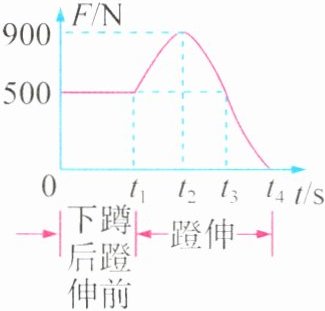 500 $t_{3}$ 解析:由图可知,运动员下蹲后、蹬伸前(图中 $0~t_{1}$ 时间段)处于静止状态,受力平衡,则运动员受到的重力和支持力大小相等,由图像可知,运动员的重力 $G = F = 500\ N$。运动员受到地面的支持力 $F$ 方向竖直向上,运动员的重力 $G$ 方向竖直向下,由图像可知,$t_{1}~t_{3}$ 时间段,$F>G$,则运动员所受合力向上,做加速运动,速度增大;$t_{3}~t_{4}$ 时间段,$F<G$,运动员受到的合力向下,由于具有惯性,运动员仍会继续向上运动,但是向上的速度会减小。所以 $t_{1}~t_{3}$ 时间段,运动员的速度一直增大,$t_{3}~t_{4}$ 时间段速度减小,则运动员在 $t_{3}$ 时刻获得向上的速度最大。