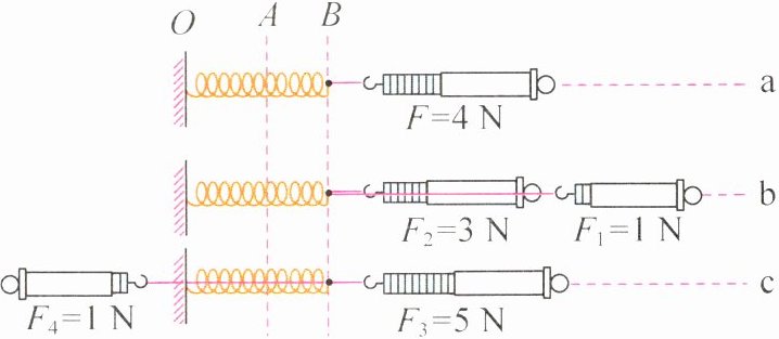 12. 新素养 科学探究(2024·河南开封期末)某中学八年级同学在探究同一直线上二力合成的实验中,把一根轻质弹簧的一端固定在O点,另一端用尼龙细线固定在弹簧测力计的挂钩上,每次实验时,他们都将弹簧由A拉伸到B位置. 研究过程及实验数据如图a、b、c所示,请仔细观察图中的装置、操作及现象,然后归纳得出初步结论.