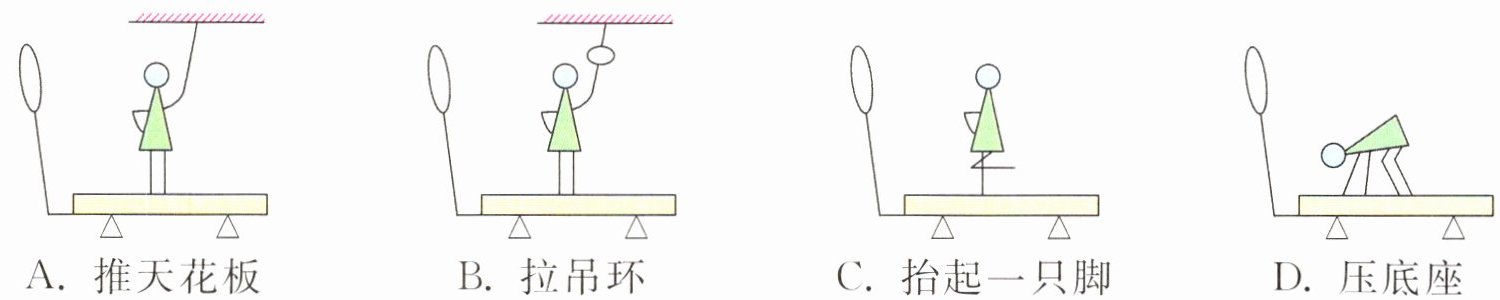 8. (2024·四川广安一模)在中考体检时,由于某些同学的体重超标,所以在测体重时,就分别采取推、拉、提、压等不当的手段来改变体重计的示数. 如图,下列方法会使体重计的示数变小的是 ( )