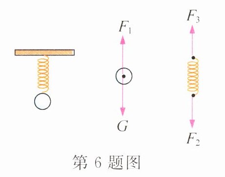 6. (2024·江苏无锡期中)如图所示,一轻质弹簧(即重力不计)上端挂在铁架台的水平横杆上,下端挂一重为$G$的小球并保持静止. 图中分别给出了该状态下小球和弹簧的受力示意图. 则$G$与_______是一对平衡力;$F_{2}$与_______是一对相互作用力.