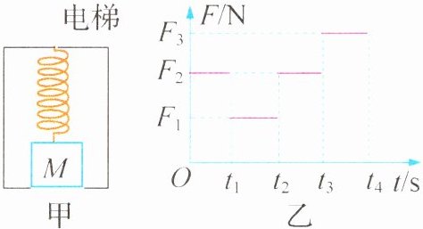 2. 新素养 科学思维 如图甲所示,物体 M 静止在电梯底部,其上表面通过轻质弹簧与电梯顶部相连. M 对电梯底部的压力为 F,忽略 M 和电梯的形变,0~$t_1$内,电梯静止,弹簧处于伸长状态,$t_1$时刻后电梯由静止开始沿竖直方向运动,0~$t_1$内,F 与 t 的关系如图乙所示,则 ( )