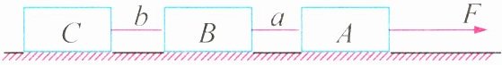 20 解析:三个完全相同的物体A、B、C对水平地面的压力相同,水平地面的粗糙程度不变,则A、B、C一起在水平面上做匀速直线运动时,受到的滑动摩擦力fₐ = fᵦ = fₑ。设fₐ = fᵦ = fₑ = f,由于B、C一起做匀速直线运动,所以B、C整体在水平方向上受力平衡,则细绳a的拉力Fₐ = fₑ + fᵦ = 2f,A在水平面上做匀速直线运动,则F = Fₐ + fₐ = 2f + f = 3f = 30 N,解得f = 10 N,所以细绳a对物体B的拉力Fₐ = 2f = 2×10 N = 20 N。