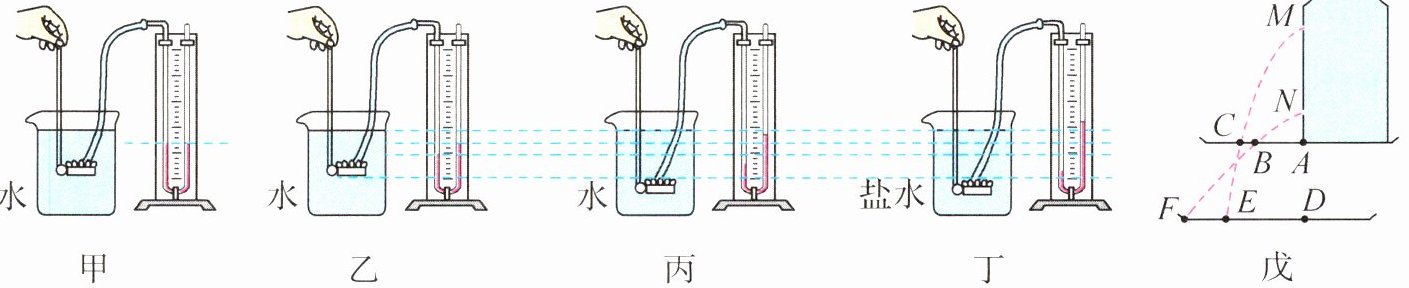(4)小明利用侧壁开孔的矿泉水瓶装满水,继续探究,当他拧开瓶盖,放开两小孔M、N,在瓶底部水平放置接水盘,发现水的落点为图戊所示的B、C点,于是他将接水盘向下平移至D处,使$MA = ND$,水的落点为E、F点. 为了比较两小孔处液体压强大小,应比较AC与______的距离.