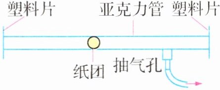 9. 如图,一根水平放置、两端开口的透明亚克力管,下部的抽气孔与抽气机相连. 将一个略小于管内径的纸团置于管中,打开抽气机,在 __________的作用下,两塑料片分别紧紧“吸附”在管子两端. 当管内气压较低时关闭抽气机,快速弹开 __________侧塑料片,纸团会从左侧管口飞出.