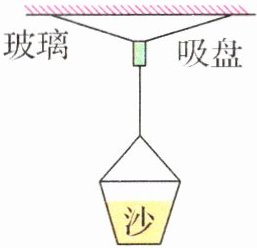 10.(2024·江西鹰潭期末)用如图所示装置粗略测量大气压的值. 把吸盘用力压在玻璃上,排出吸盘内的空气,吸盘压在玻璃上的面积为 $4×10^{-4}\text{ m}^{2}$,轻轻向挂在吸盘下的小桶内加沙子. 吸盘刚好脱落时,测出吸盘、小桶和沙子的总质量为3.5 kg.($g$取10 N/kg)则:
