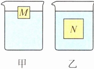 8.(2024·江苏苏州期末)水平桌面上放有两个完全相同的烧杯甲、乙,分别盛有不同液体. 将质量相等、体积不等($V_{M}<V_{N}$)的实心正方体物块$M$、$N$分别放入两烧杯中,静止时如图所示,液面恰好相平. 则$M$受到的浮力_______$N$受到的浮力,甲杯底受到的压力_______(前两空均选填“大于”“等于”或“小于”)乙杯底受到的压力;若将$N$也放入甲杯液体中,静止时$N$_______(选填“漂浮”“悬浮”或“沉底”).