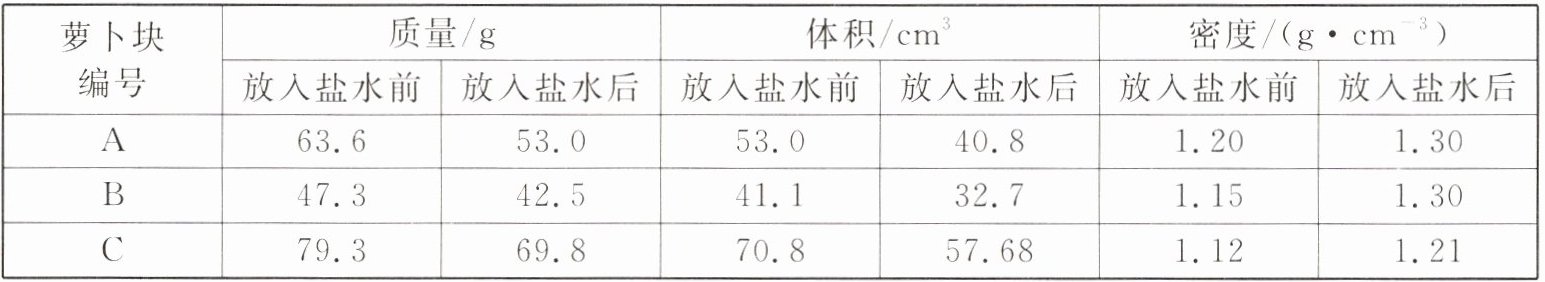 (3) 由表中数据可知,萝卜块的质量和体积都变小了,不能确定萝卜块下沉是由质量变小还是体积变小导致的,所以不能得出“萝卜块体积变小,浮力变小,导致萝卜块下沉”的结论。