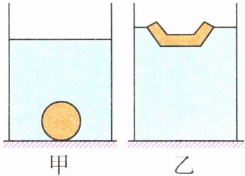 5. 实心的钢铁会沉在水底,而钢铁造的船可以漂浮在水面.针对这种现象,同学们使用橡皮泥进行了探究.如图甲所示,把一块质量为90 g、体积为60 cm³的橡皮泥投入水中,橡皮泥沉底;如图乙所示,把同一块橡皮泥捏成一艘小船,橡皮泥小船漂在水面.求:($\rho_{水}=1.0\times10^{3}$ kg/m³,g取10 N/kg)