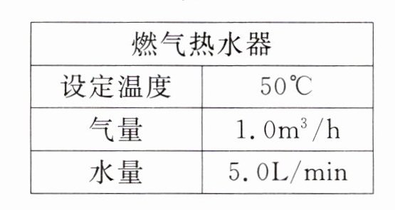 (1)解:燃气热水器正常工作10min流出的热水的体积:$V_{水}=5.0L/min×10min = 50L = 5×10^{-2}m^{3}$,流出的热水的质量:$m_{水}=\rho_{水}V_{水}=1.0×10^{3}kg/m^{3}×5×10^{-2}m^{3}=50kg$