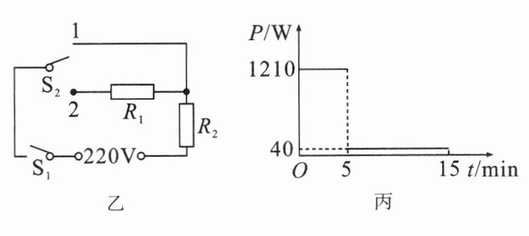 (3)由$P = \frac{U^{2}}{R}$可知,当电源电压不变时,电路中的总电阻越大,功率越小,当$S_{1}$闭合,$S_{2}$接 1 时电路只有$R_{2}$接入电路,电路处于加热状态,当$S_{1}$闭合,$S_{2}$接 2 时,$R_{1}$与$R_{2}$串联接入电路,电路处于保温状态,由$P_{热}=\frac{U^{2}}{R_{2}} = 1210W$解得$R_{2}=40\Omega$,由$P_{温}=\frac{U^{2}}{R_{1}+R_{2}} = 40W$,解得$R_{1}+R_{2}=1210\Omega$,故$R_{1}$的阻值为$R_{1}=1210\Omega - 40\Omega = 1170\Omega$