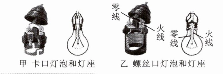 14. 如图所示是卡口灯泡和灯座、螺丝口灯泡和灯座,卡口灯泡灯座的触头在灯座内,当灯按进去后,不会裸露在外边,而螺丝口灯泡的灯座的一个接线柱与灯的螺丝套相连,裸露在外边,若接了____线,就有安全隐患,故与螺丝套相连的接线柱要与____线相连。
