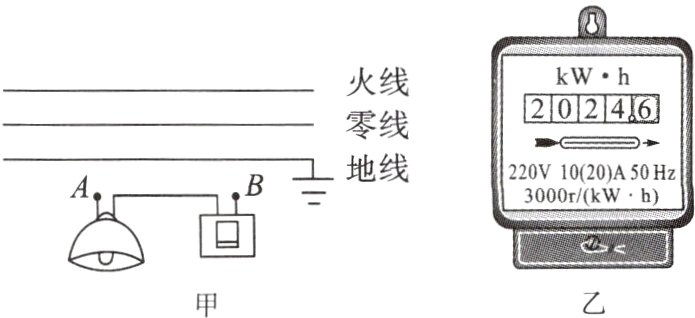4.(眉山市中考)小龙和父亲一起为家里安装电灯,连接的部分电路如图甲,A、B两接线点,与火线相连的是____点;家里电能表如图乙,原有用电器的总功率是3600W,从电能表使用的角度考虑,还能添加用电器的总功率不超过______W。