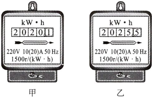13. 李老师出差时恰逢抄表日,家中电能表的示数如图甲所示,出差返回时发现家中有一盏15W的台灯亮着,检查其他电器发现在出差时均已切断电源,再查看电能表,示数如图乙所示,则这盏台灯消耗的电能为______kW·h,李老师出差的时间为______天。