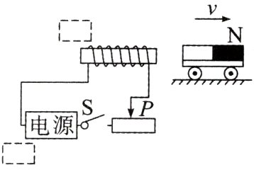 7. 如图所示,将一条形磁体放在小车上,并靠近螺线管,闭合开关后小车向右运动,请在方框中标出通电螺线管的“N”或“S”极和电源的“+”或“-”极。