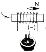 5. 小硕将铜片、锌片插入橙子中,便制作成了水果电池,连接在螺线管上,小磁针静止时N极指向如图所示,请在括号中标出水果电池的“+”“-”极,并标出通电螺线管左侧磁感线的方向。