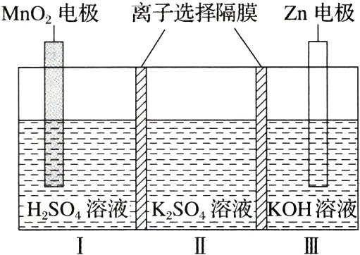 4. (2022·全国甲卷,10)一种水性电解液$Zn - MnO_{2}$离子选择双隔膜电池如图所示$[KOH$溶液中,$Zn^{2 + }$以$Zn(OH)_{4}^{2 - }$存在$]$。电池放电时,下列叙述错误的是( )