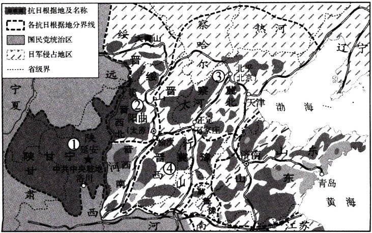 (1)依据材料判断兴县农村剧团的活动区域位于图中哪个序号附近;说明该剧团所属根据地在地理位置上的重要战略作用。(4分)