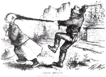B [鸦片战争后华工出国,且被运往美洲等地,形成了苦力贸易,在美国,华工是加利福尼亚金矿和中央太平洋铁路工地等繁重劳动场所的主要劳动力,漫画中的人物形象表明在美华工遭受虐待和压榨,故选B项;材料信息反映的是华工在美国的遭遇,而不是美国对中国发动侵略战争,排除A项;图中挥舞着鞭子的美国白人并非在进行文化输出,无从体现中美文化冲突,排除C项;材料信息没有涉及中美国家关系,排除D项。]