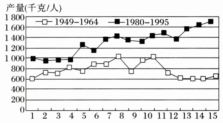 D [中华人民共和国成立后与农村改革初期前后两个16年,山东省人均粮食产量变化,与当时国家政策的调整密切相关,D项正确;据材料信息可知,土地改革对农业生产作用还是较为显著的,“作用相对有限”的表述与史实不符,排除A项;到1952年底,我国农业经济已经全面恢复,排除B项;材料中没有涉及调整国民经济提高农产品商品化程度的相关信息,排除C项。]