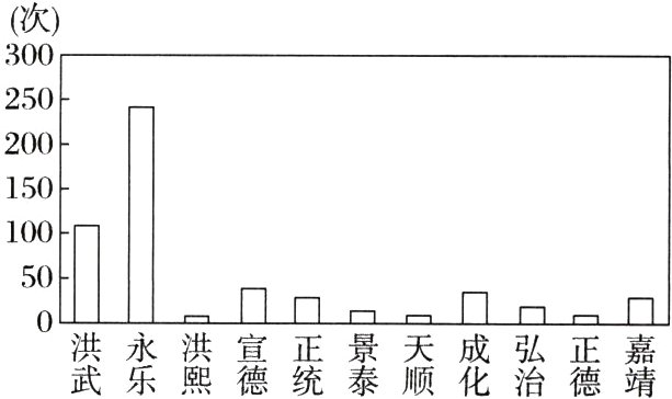 D [据柱状图可知,在明朝建立之初的洪武和永乐年间,朝贡贸易次数较多,其主要原因在于该时期国家统一、社会稳定、经济发展以及政府政策支持。自洪熙年间之后,朝贡贸易次数呈断崖式下降,其主要原因在于当时政治腐败、社会动荡以及西方殖民者东来,故选D项;此时期的明朝是一个独立自主、闭关自守的封建国家,其受世界局势影响不大,排除A项;柱状图仅显示明朝时期的朝贡贸易次数,且明清时期的闭关锁国政策使中国逐渐落后于世界潮流,而不是“朝贡政策”,排除B项;柱状图仅显示明朝时期的朝贡贸易次数,并没有将其与其他国家进行对比,排除C项。]