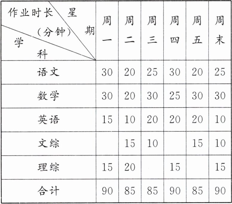 |作业时长(分钟)\星期|周一|周二|周三|周四|周五|周末|