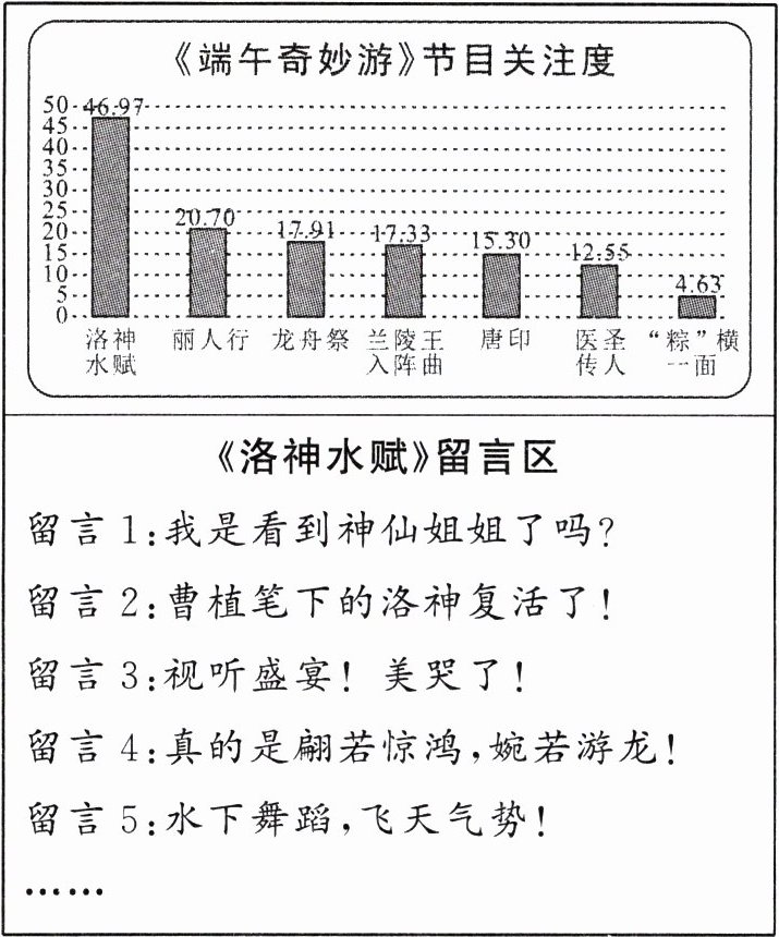 (2)《端午奇妙游》的开场节目《洛神水赋》刷屏,被评为全国“2021年十大文化创意事件”。请你根据下面材料写几句话,把《洛神水赋》推荐给同学们观看。60字左右。