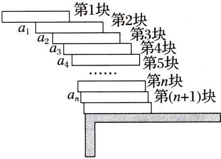 例2 (2024·泉州模拟)将足够多的一批规格相同、质地均匀的长方体薄铁块叠放于水平桌面上,每个铁块总比其下层铁块向外伸出一定的长度,如图,那么最上层的铁块最多可向桌沿外伸出多远而不掉下呢?这就是著名的“里拉斜塔”问题.将铁块从上往下依次标记为第1块、第2块、第3块、…、第$n$块,将前$i(i = 1,2,3,\cdots,n)$块铁块视为整体,若这部分的重心在第$(i + 1)$块的上方,且全部铁块整体的重心在桌面的上方,整批铁块就保持不倒.设这批铁块的长度均为1,若记第$n$块比第$(n + 1)$块向桌沿外多伸出的部分的最大长度为$a_{n}$,则根据力学原理,可得$a_{2}=\frac{1}{4}$,且$\{ \frac{1}{a_{n}}\}$为等差数列.