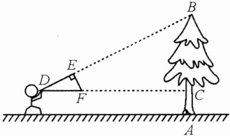 在Rt△DEF中,$DE^{2}+EF^{2}=DF^{2}$,即$40^{2}+EF^{2}=50^{2}$,所以$EF = 30$。由题意得∠BCD = ∠DEF = 90°,∠CDB = ∠EDF,所以△DCB∽△DEF,所以$\frac{BC}{EF}=\frac{DC}{DE}$。因为EF = 30 cm = 0.3 m,DE = 40 cm = 0.4 m,CD = 12 m,所以$\frac{BC}{0.3}=\frac{12}{0.4}$,解得BC = 9 m。因为AC = 1.5 m,所以AB = AC + BC = 1.5 + 9 = 10.5(m)