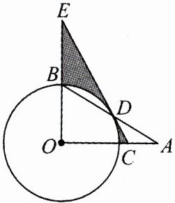 9.(通辽中考)如图,在$Rt\triangle AOB$中,$\angle AOB = 90^{\circ}$,以$O$为圆心,$OB$的长为半径的圆交边$AB$于点$D$,点$C$在边$OA$上且$CD = AC$,延长$CD$交$OB$的延长线于点$E$.