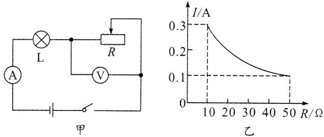 5. (2022·营口)(多选)如图甲所示的电路中,电源电压不变,小灯泡$L$的阻值不变,滑动变阻器$R$的规格是“$50\ \Omega\ \ 1\ A$”。闭合开关,在保证电路元件安全的前提下,最大范围内移动滑片,绘制通过变阻器的电流与变阻器阻值关系的图象如图乙所示。下列说法正确的是 ( )