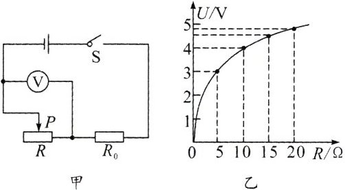 4. (2022·苏州)图甲所示的电路中,电源电压不变,$R_0$为定值电阻,$R$为滑动变阻器。闭合开关,滑片$P$移动过程中,电压表示数随滑动变阻器阻值变化的关系如图乙所示。下列说法正确的是 ( )