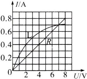 1. 灯泡$L$与定值电阻$R$的$I - U$图象如图所示。若将$L$与$R$串联在$8\ V$的电源上,下列说法正确的是 ( )