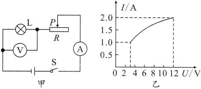 6.如图甲所示,电源电压12 V保持不变,闭合开关S后,当滑片P从最右端向最左端滑动的过程中,小灯泡的$I - U$关系图象如图乙所示,最后小灯泡正常发光。下列说法中正确的是 ( )
