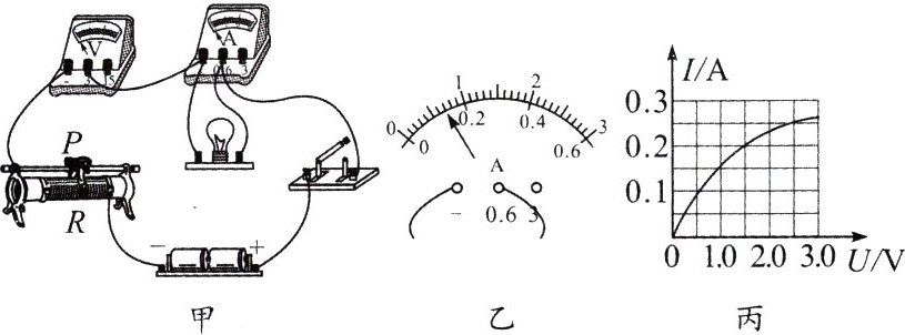 (4)正确连接好电路后,闭合开关,从大到小调节滑动变阻器的阻值。电压表读数为2.5 V时,电流表的示数如图丙所示。测得小灯泡的额定功率是** **W;通过实验还发现在小灯泡逐渐变亮的过程中,电压表示数与电流表示数的比值在增大,造成这一现象的原因是** **。