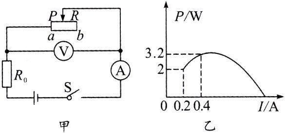 (1) 由图甲可知,定值电阻$R_0$与滑动变阻器$R$串联,电压表测滑动变阻器两端的电压;由图乙可知,当滑片$P$在$b$端时,电路中的电流最小,且$I_b = 0.2\ A$,$P_b = 2\ W$,由$P = UI = I^2R$可知,滑动变阻器的最大阻值$R_b=\frac{P_b}{I_b^2}=\frac{2\ W}{(0.2\ A)^2}=50\ \Omega$。