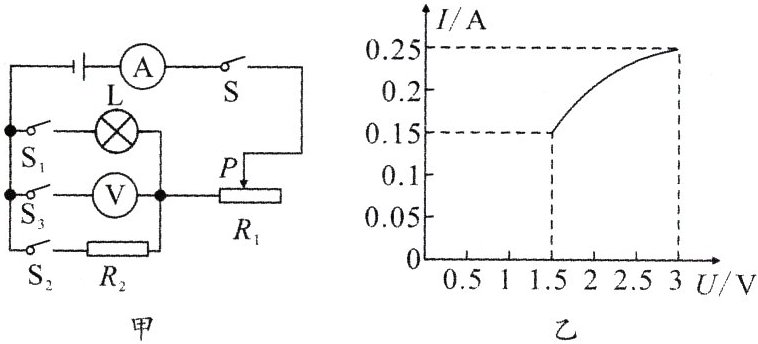 (3)只闭合开关S、$S_1$和$S_3$,移动滑动变阻器的滑片$P$,小灯泡L的$I - U$关系如图乙所示,在保证各电路元件安全的情况下,滑动变阻器$R_1$允许接入电路的阻值变化范围是多少?