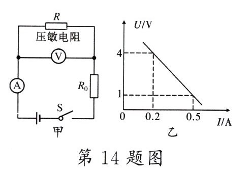 14.如图甲所示,R是压敏电阻,其阻值随压力的变化而改变,R₀为定值电阻,闭合开关S,改变R上压力大小。两电表示数之间的关系图象如图乙所示,则电源电压U=______V,R₀=______Ω;当R₀消耗的电功率为0.4 W时,R消耗的电功率P=______W。