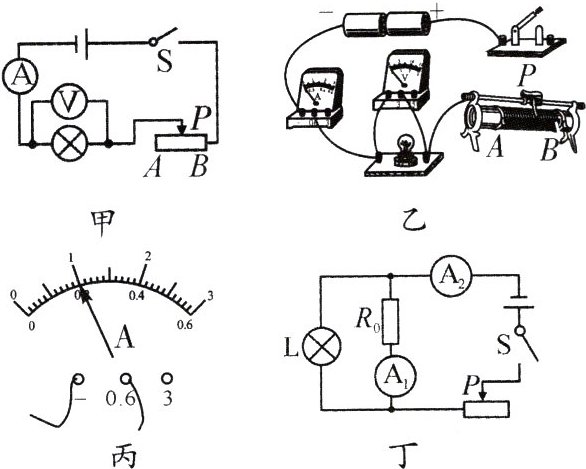 (5)小丹经过思考,发现用两只电流表和一个阻值为R₀的定值电阻也可以测出小灯泡的额定功率。她设计的电路如图丁所示,具体操作是:闭合开关S,调节滑动变阻器使电流表A₁的示数为__________时,小灯泡正常发光,此时电流表A₂的示数为I₂。则小灯泡额定功率的表达式为Pₙ=____________。(用I₂、R₀表示)