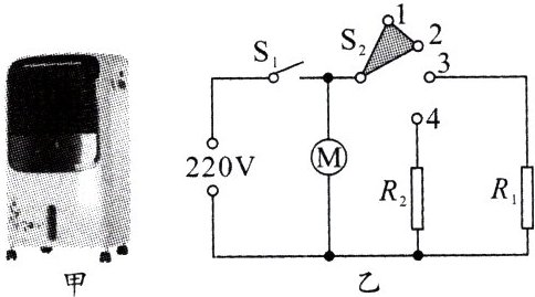 16.如图甲是文文同学家新买的一台冷暖空调扇,其内部简化电路如图乙所示,R₁、R₂均为发热电阻,R₁的阻值为110 Ω,M是电动机。开关S₁闭合,当S₂接1、2时吹冷风;当S₂接2、3时吹温风;当S₂接3、4时吹热风,此时空调扇的总功率为1100 W。已知:电源电压为220 V,c₍冰₎=2.1×10³ J/(kg·℃)。求: