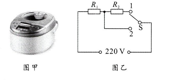 12.(2022·自贡)小亮在家煲汤时使用的电饭煲的部分参数如表所示,其简化电路如图乙所示,$R_{1}$、$R_{2}$均是发热电阻(阻值不随温度变化),欲将质量为1 kg,初温为20 ℃的汤加热至100 ℃,设此汤的比热容为$c_{汤}=4.0×10^{3}\ J/(kg·℃)$。求:
