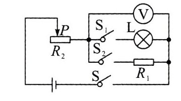(2) 断开$S_{2}$,闭合$S$和$S_{1}$,小灯泡和滑动变阻器串联,当滑片$P$移到变阻器中点时,小灯泡正常发光,电路中的电流$I = I_{L}=0.5\ A$,滑动变阻器两端的电压$U_{滑}=I×\frac{1}{2}R_{滑大}=0.5\ A×\frac{1}{2}×20\ \Omega = 5\ V$,电源电压$U = U_{L}+U_{滑}=3\ V + 5\ V = 8\ V$