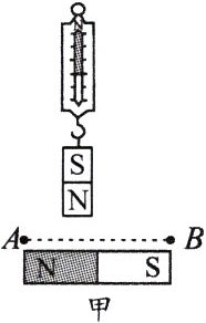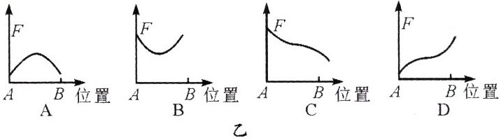 10. 如图甲所示,在水平地面上的条形磁体上方有挂在弹簧测力计上的小磁体(下端为N极)。小辉提着弹簧测力计向右缓慢移动,挂在弹簧测力计上的小磁体下端沿图示水平路线从$A$缓慢移到$B$。则图乙中能正确反映弹簧测力计示数$F$随位置变化关系的是( )