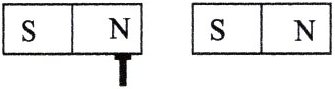12. 如图所示,水平放置的条形磁体的一端(N极)吸引着一枚较重的铁钉,若另一根相同的条形磁体的S极向原来磁体的N极靠拢时,则出现出现的情况是( )