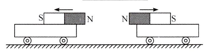5. 如图所示,将分别载有一根条形磁体的两辆小车彼此靠近,然后同时释放,两辆小车将向______(选填“相同”或“相反”)方向运动,最后静止。此现象说明:同名磁极______。